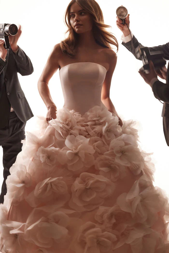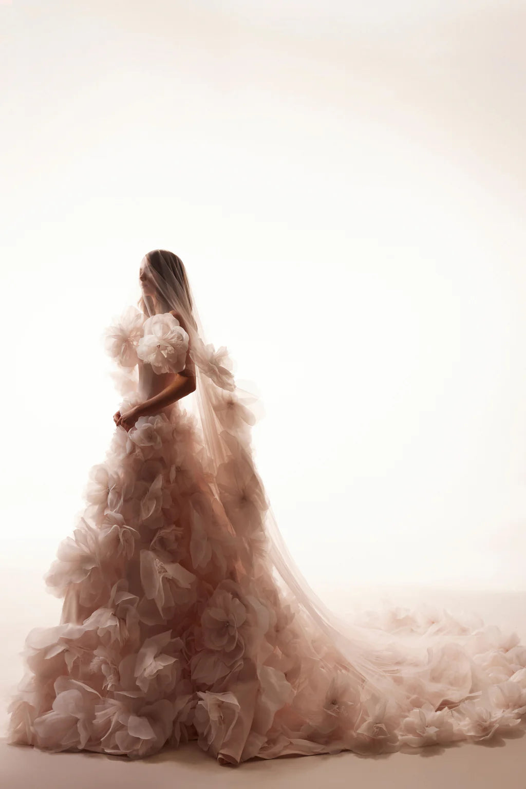 Die Anfertigung erfolgt nach der Bestellung - Bearbeitung ca. 8-12 Wochen. A gorgeous powdery wedding dress is entirely decorated with manually made flowers. The gown with an asymmetrical bodice is made of matte satin. There is a zipper and inner lacing. The skirt is manually embroidered with three-dimensional flowers that are made of organza and mesh. They are embellished with pearls. There is a powdery bridal veil that is also embroidered with the same flowers as the gown.
