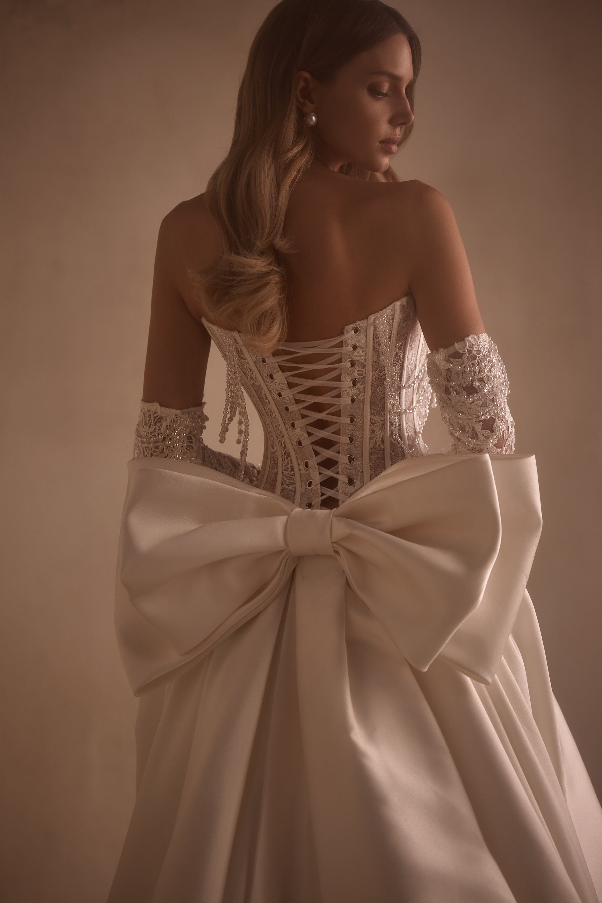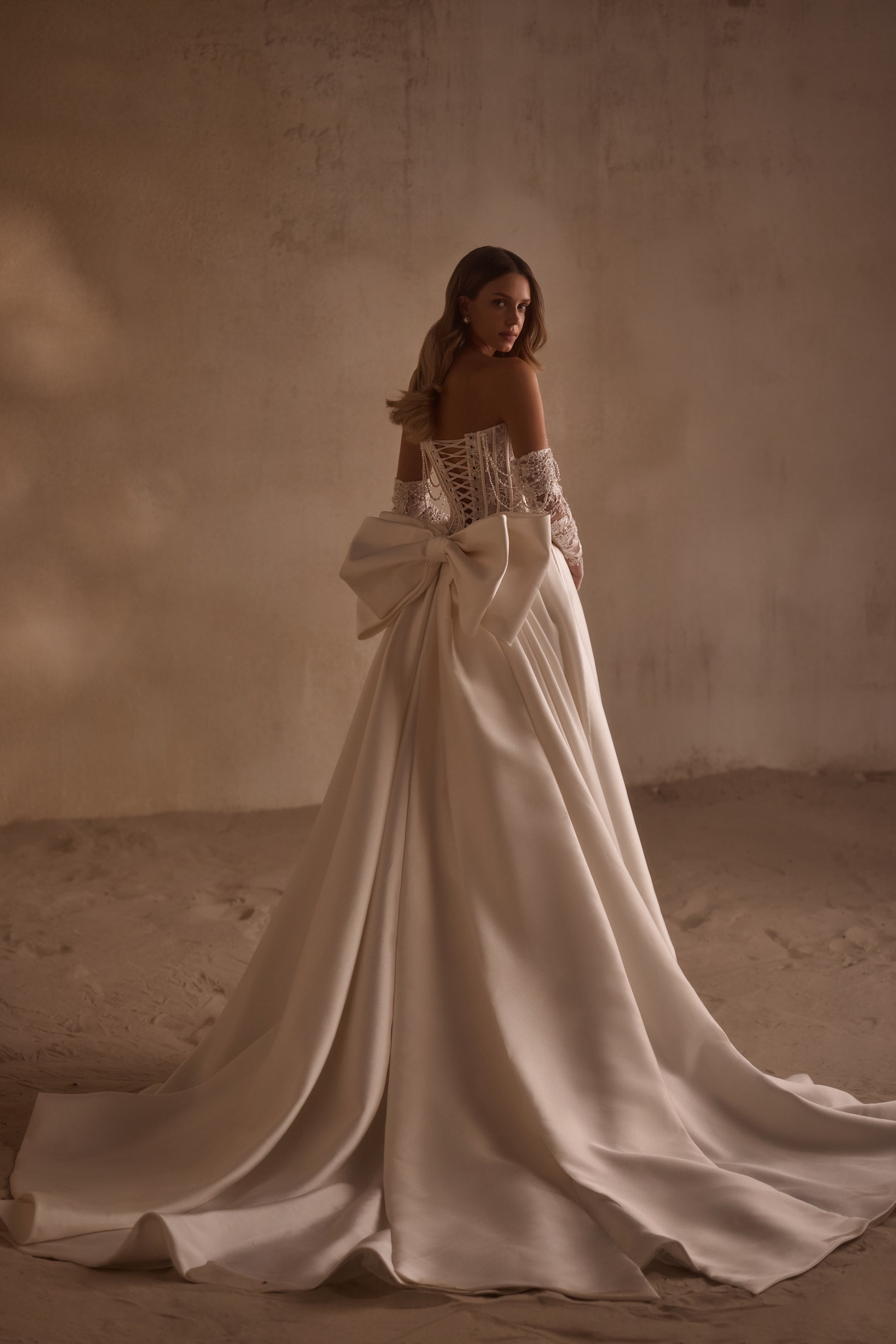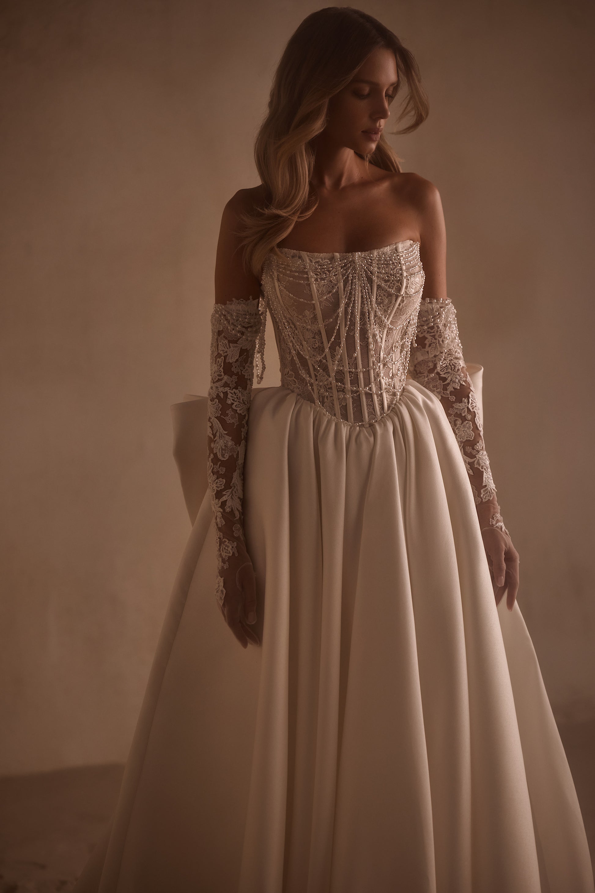Die Anfertigung erfolgt nach der Bestellung - Bearbeitung ca. 8-12 Wochen. An elegant ball gown is made of smooth Mikado fabric. The off-the-shoulder bodice is made from Chantilly lace and adorned with a detachable necklace of pearls and crystals. There is lacing at the back of the dress. The pleated skirt flows seamlessly into a train. The look can be completed with detachable details — lace gloves that are embellished with pearls, a striking bow, or smooth sleeves fastened with buttons.