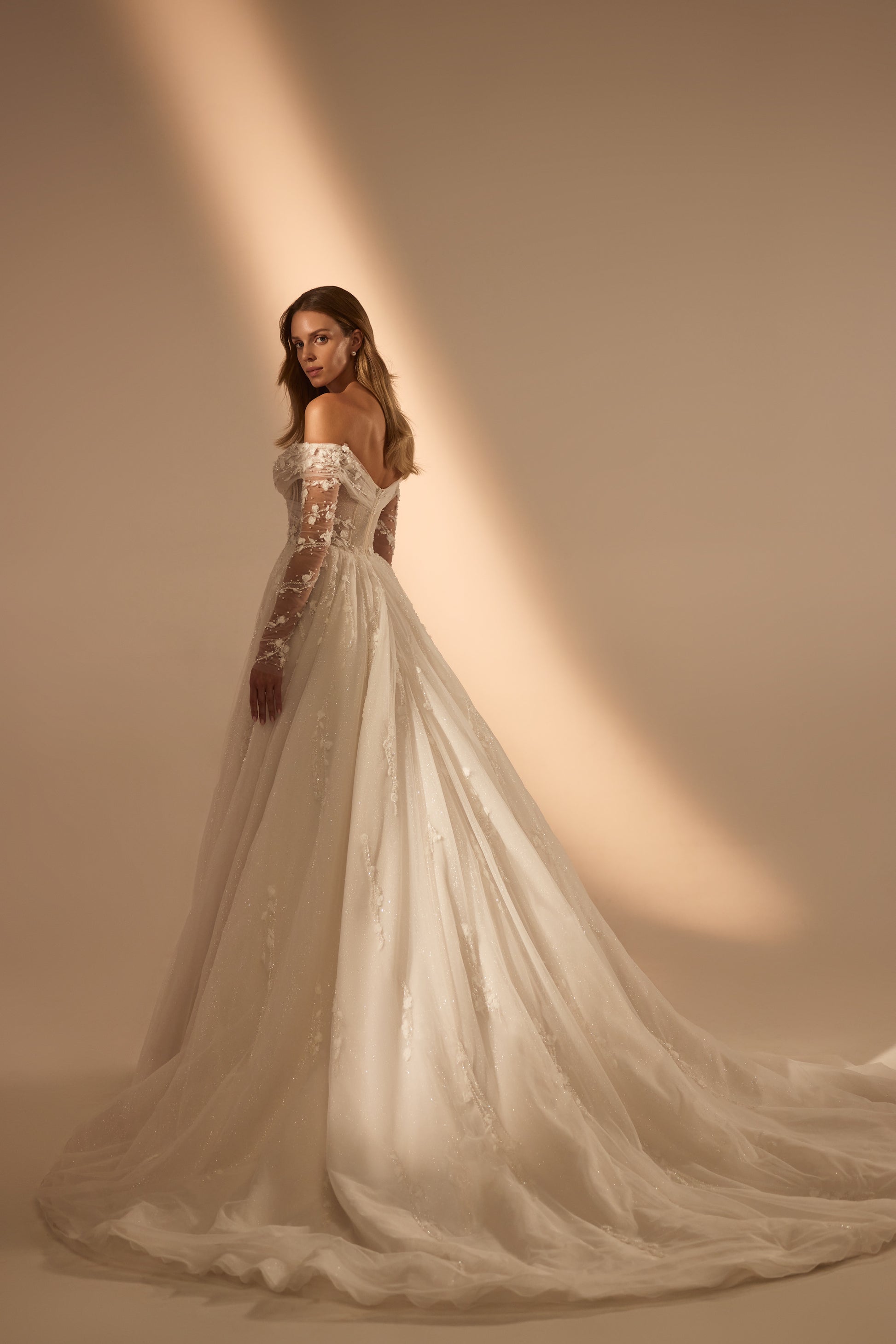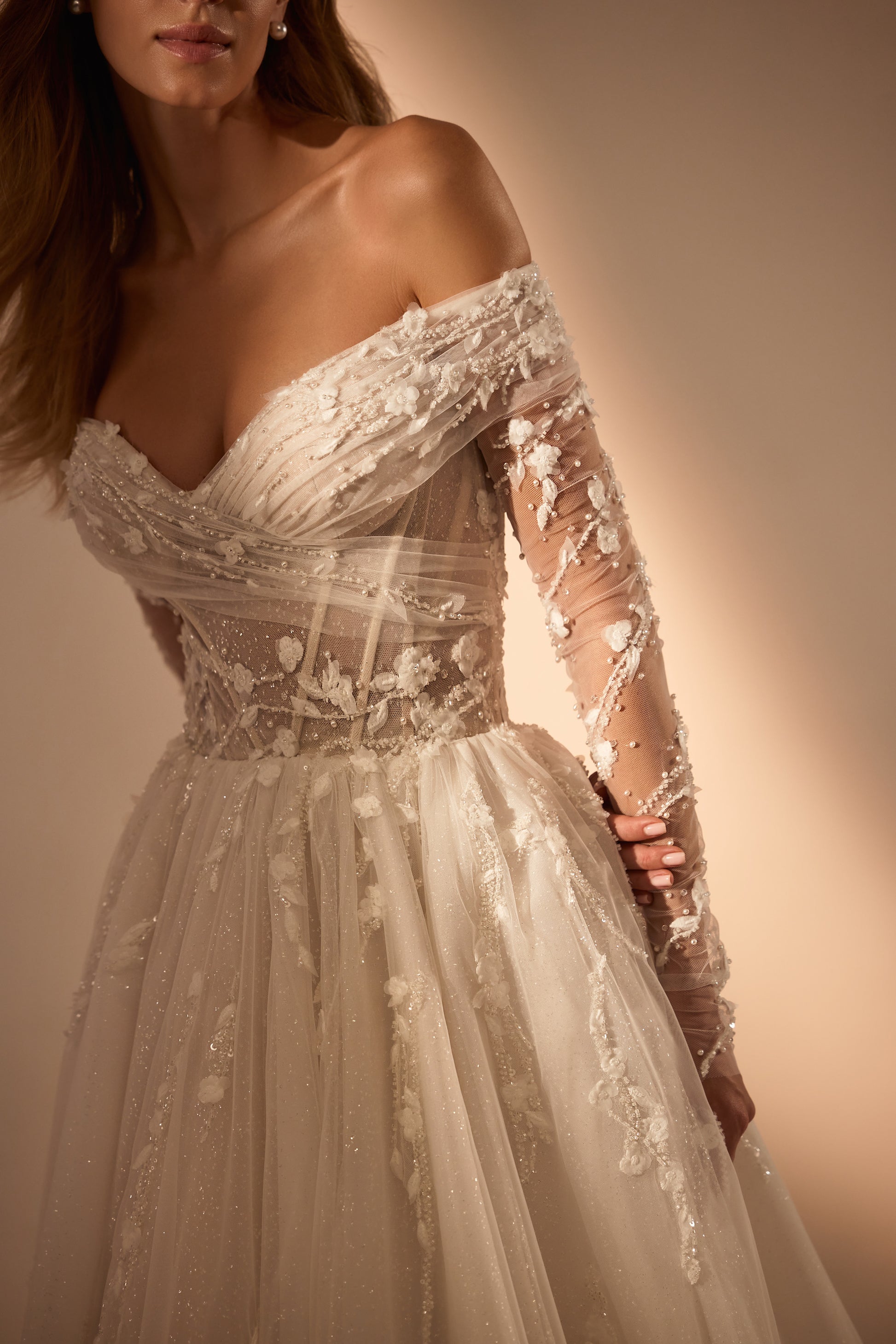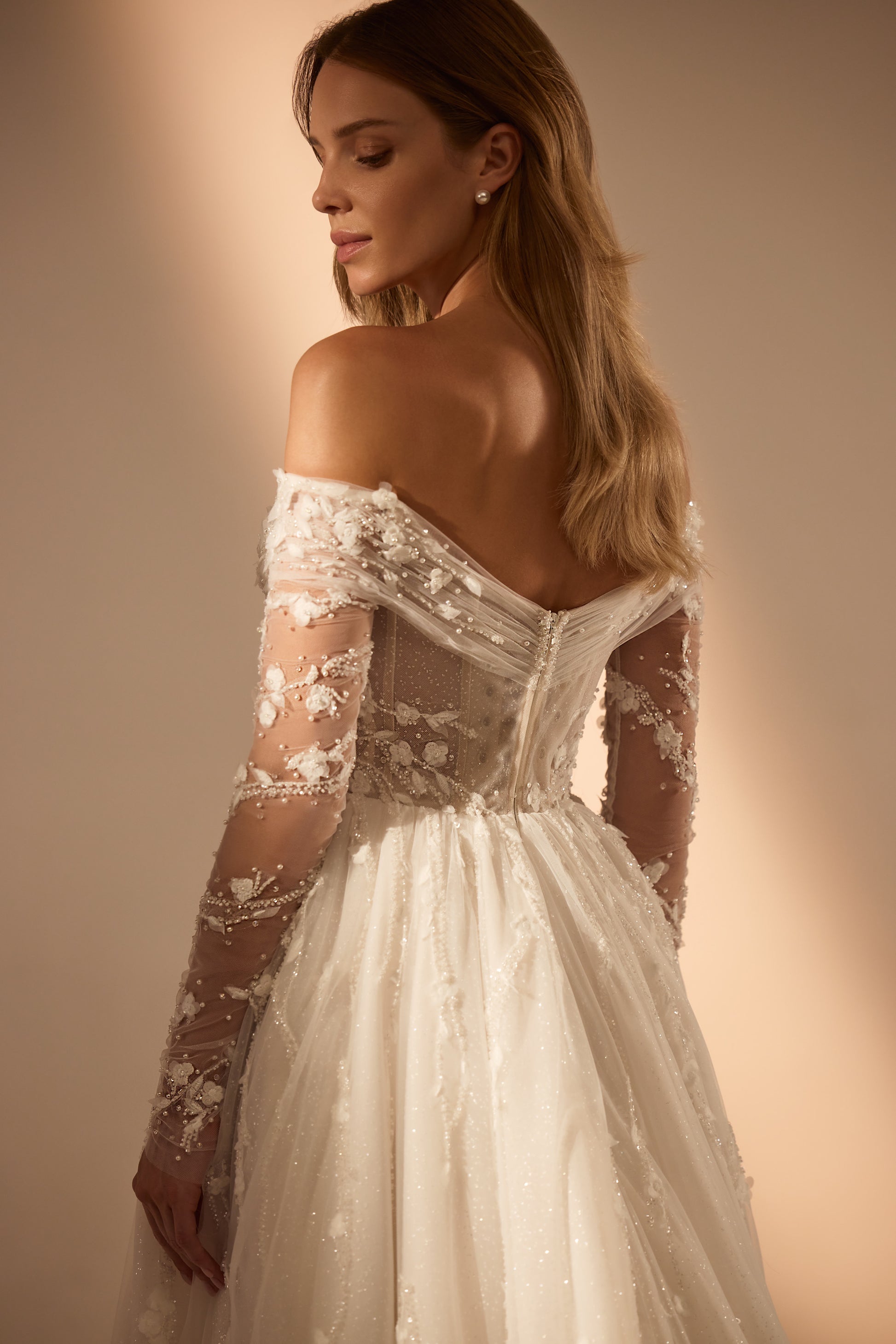 Die Anfertigung erfolgt nach der Bestellung - Bearbeitung ca. 8-12 Wochen. A dreamy A-line nude gown has an off-the-shoulder bodice that is decorated with draped mesh, sequins, and lace flowers. It fastens with a zipper and has internal lacing. The skirt is made of organza and sheen, adorned with lace, voluminous flowers, and sequins. There is a long train. The look can also be complemented with long detachable sleeves embellished with flowers and embroidery.