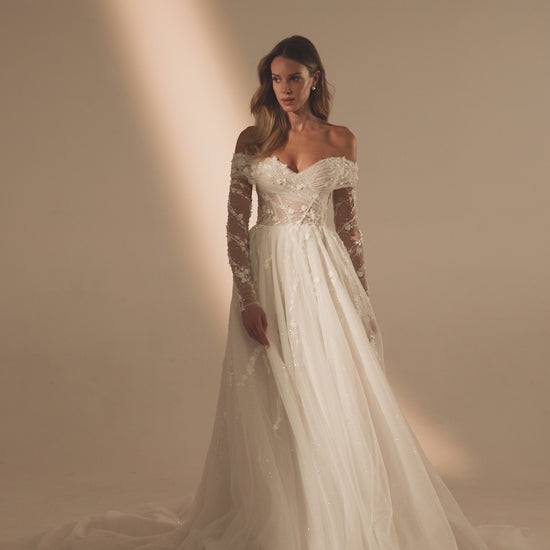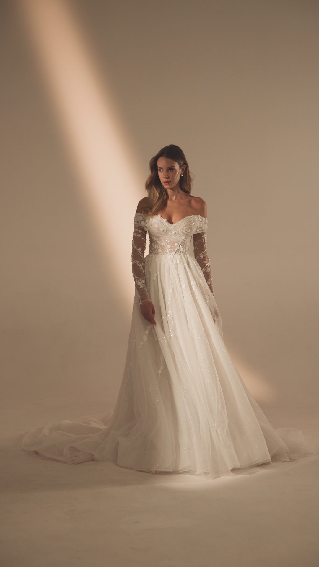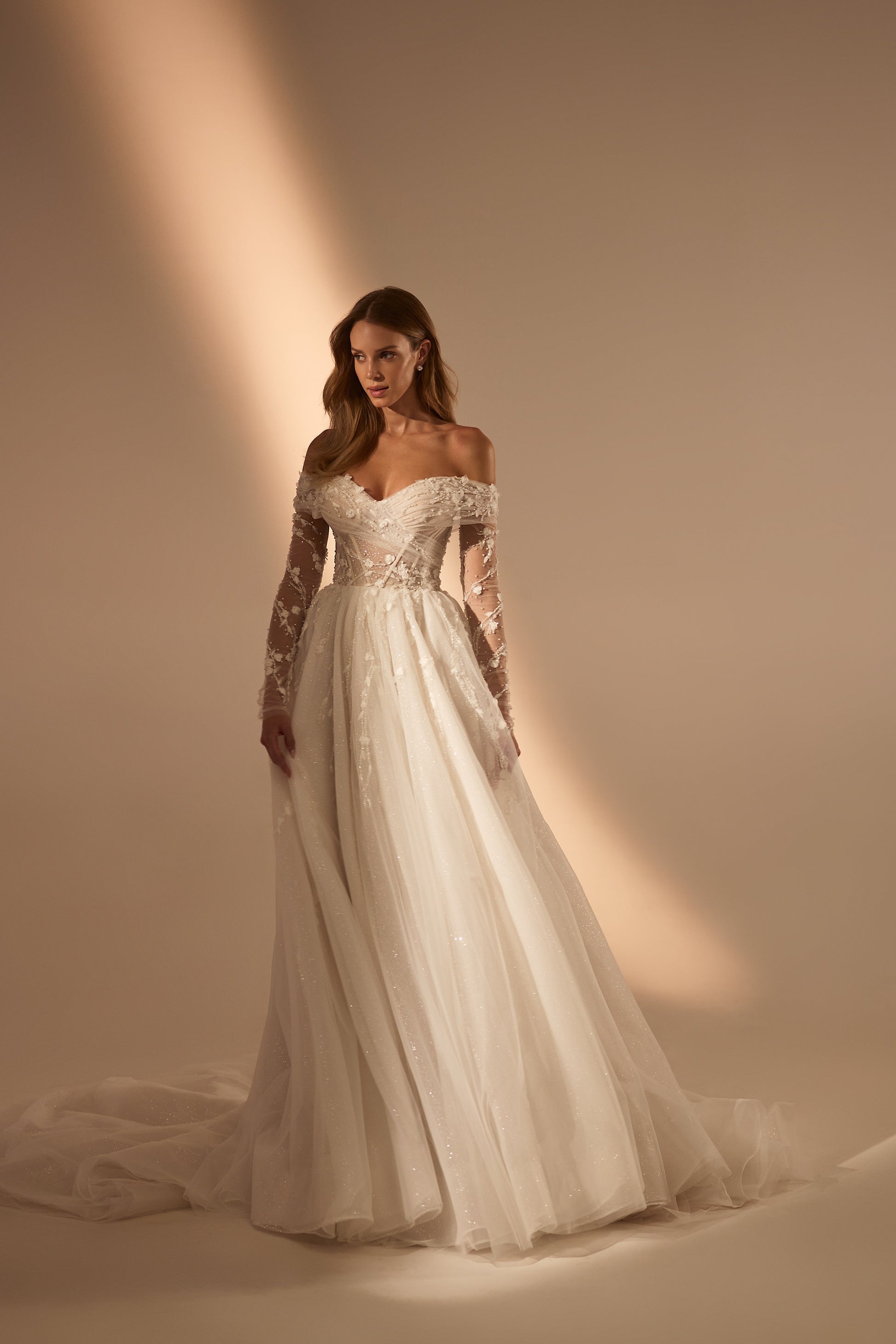 Die Anfertigung erfolgt nach der Bestellung - Bearbeitung ca. 8-12 Wochen. A dreamy A-line nude gown has an off-the-shoulder bodice that is decorated with draped mesh, sequins, and lace flowers. It fastens with a zipper and has internal lacing. The skirt is made of organza and sheen, adorned with lace, voluminous flowers, and sequins. There is a long train. The look can also be complemented with long detachable sleeves embellished with flowers and embroidery.