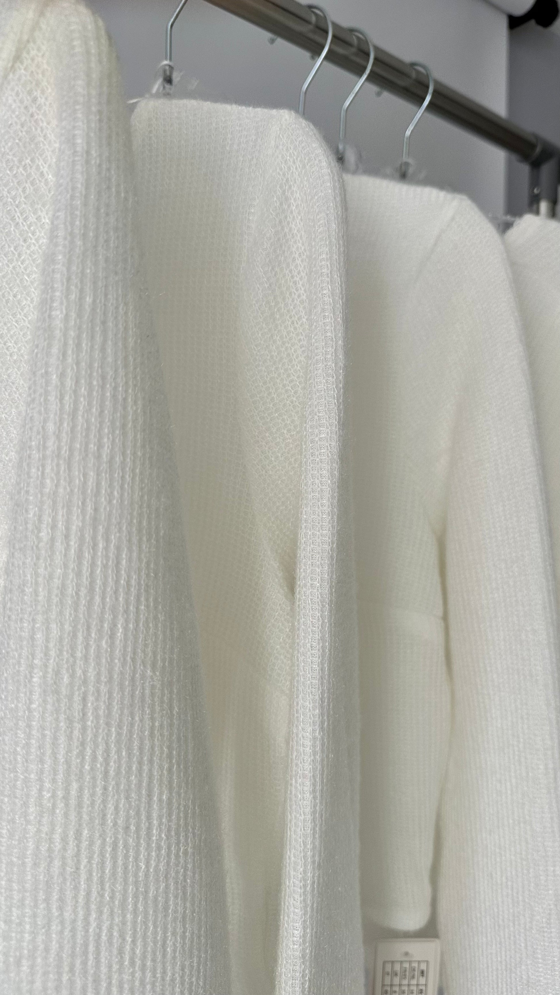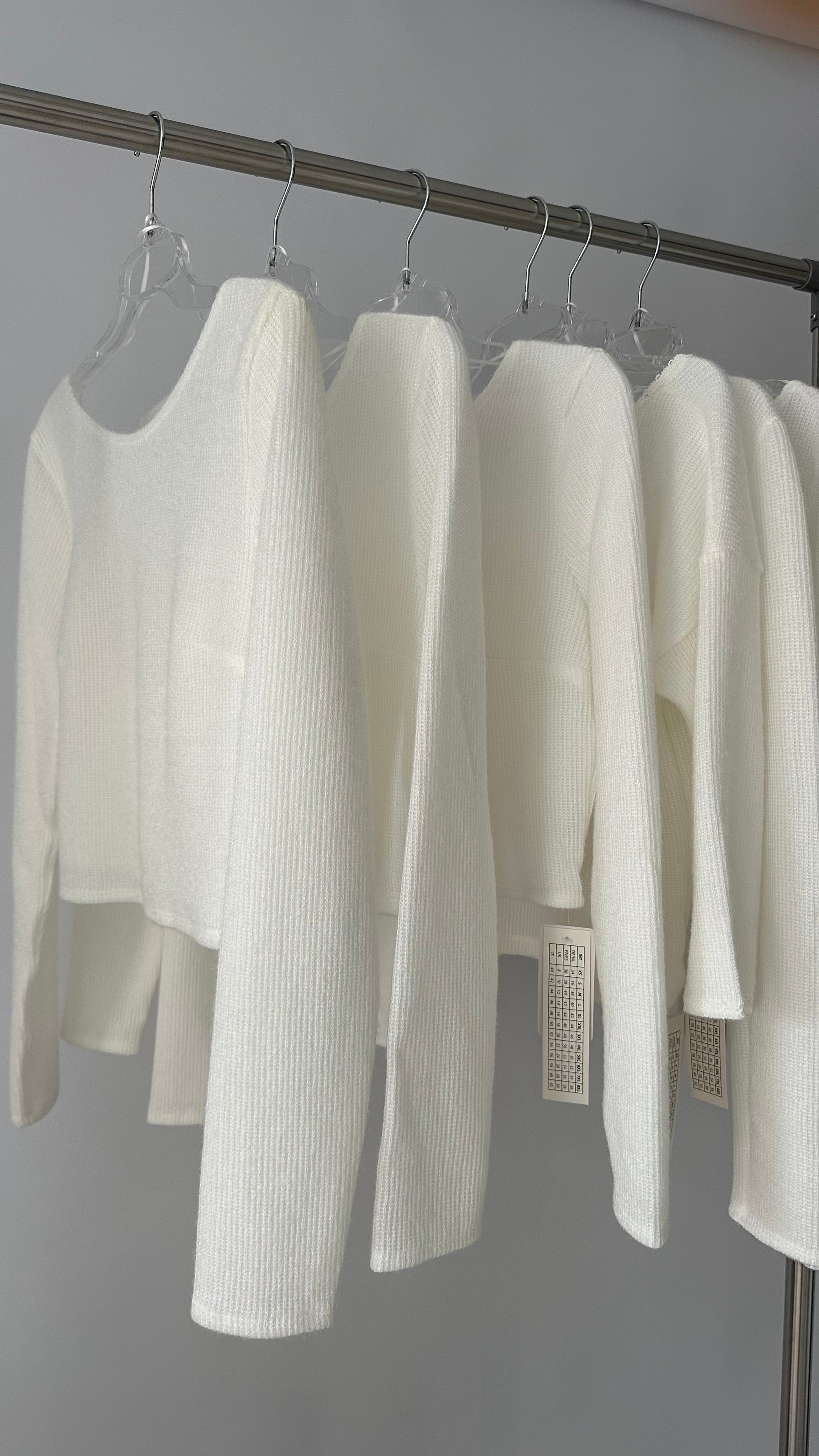 Der Pullover ist mit langen Ärmeln und einem klassischen, runden Halsausschnitt gestaltet, wodurch er eine schlichte, aber edle Silhouette schafft. Dank seines minimalistischen Designs lässt er sich vielseitig kombinieren – ob zur festlichen Brautmode oder als elegantes Key-Piece nach der Hochzeit.