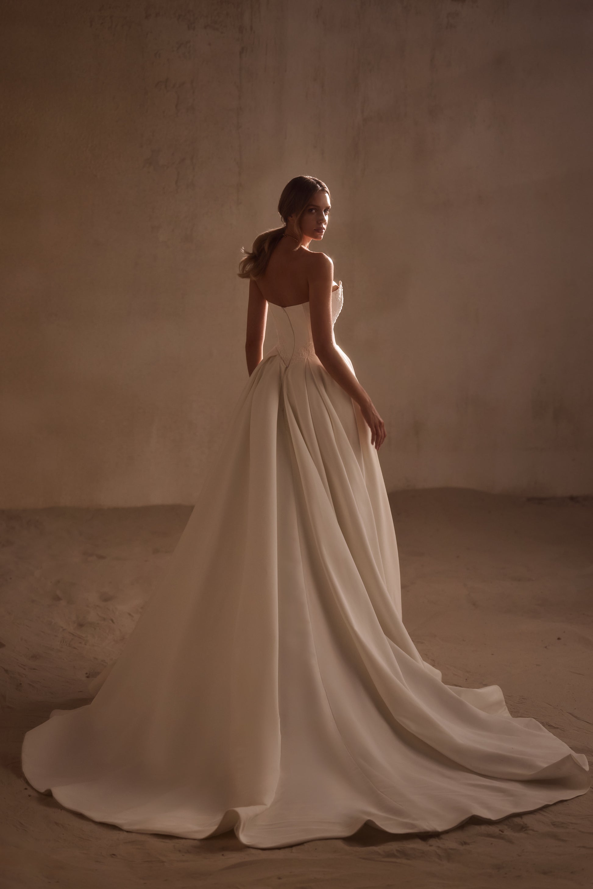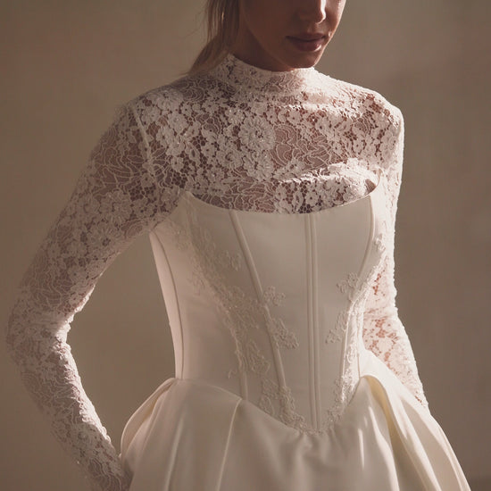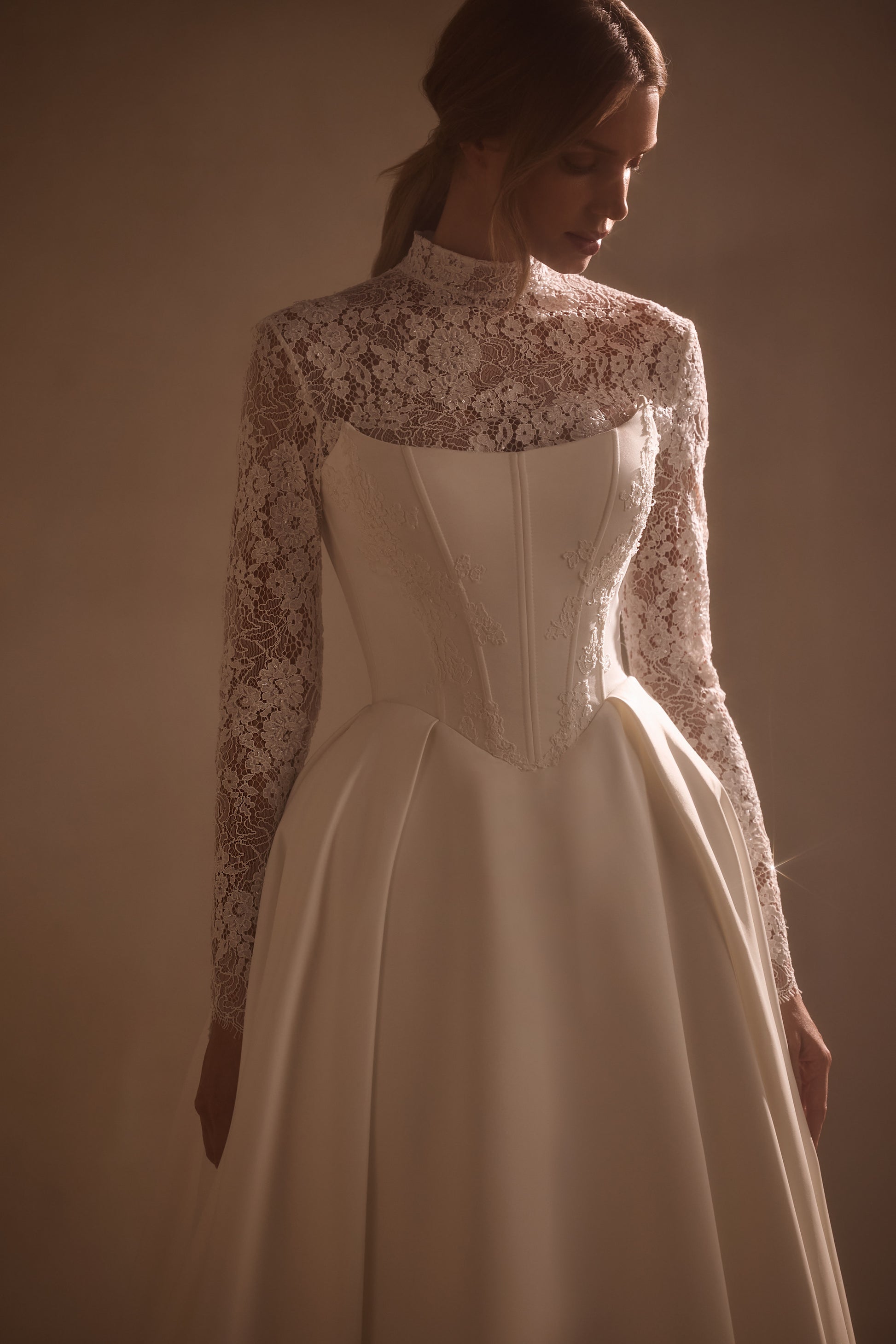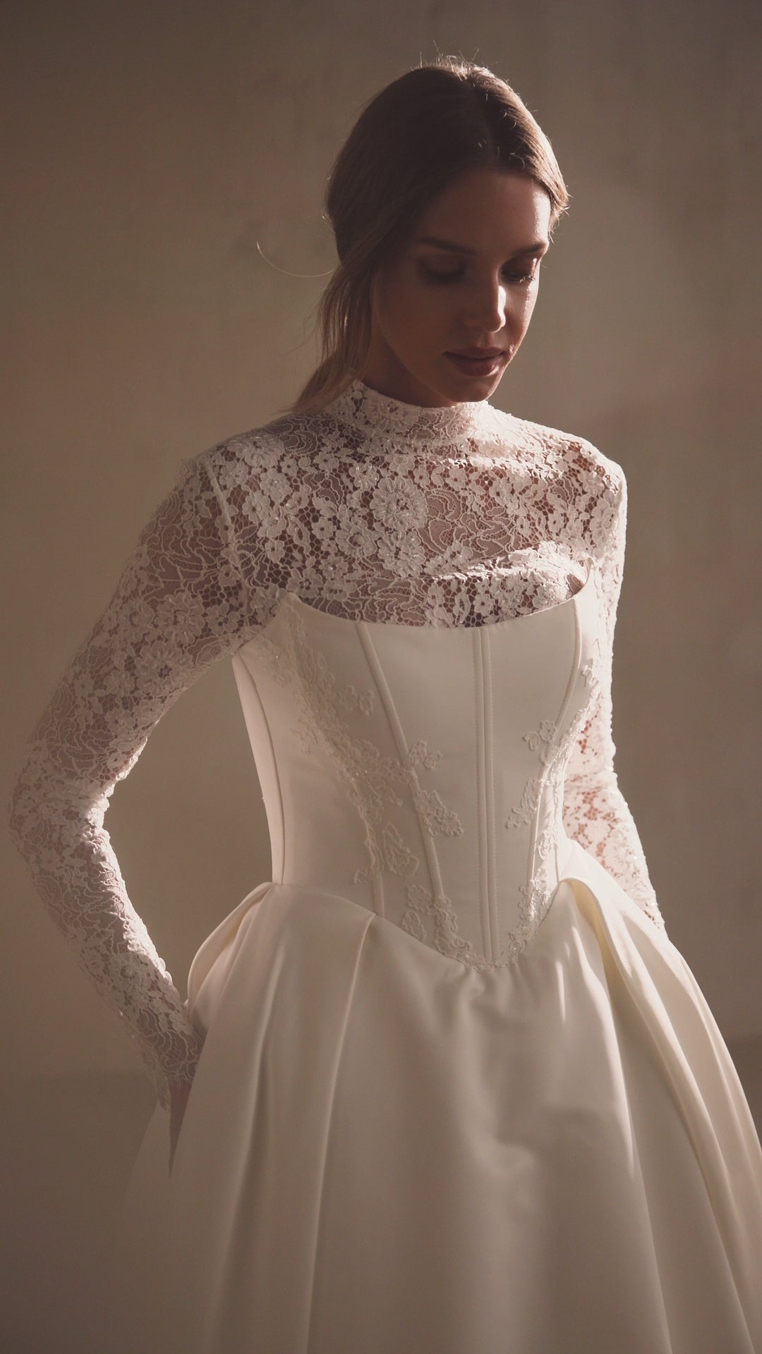 Die Anfertigung erfolgt nach der Bestellung - Bearbeitung ca. 8-12 Wochen. A romantic ball gown is made from exquisite matte satin. The sculptural corset is decorated with vertical lines and matte Chantilly lace. At the back, it has a zipper closure and internal lacing. The skirt, with wide pleats, smoothly goes into a long train. The look can be enhanced with a detachable bodysuit. The bodysuit is made of Chantilly lace, it has a high collar and long sleeves. There are buttons at the back and on the sleeves.