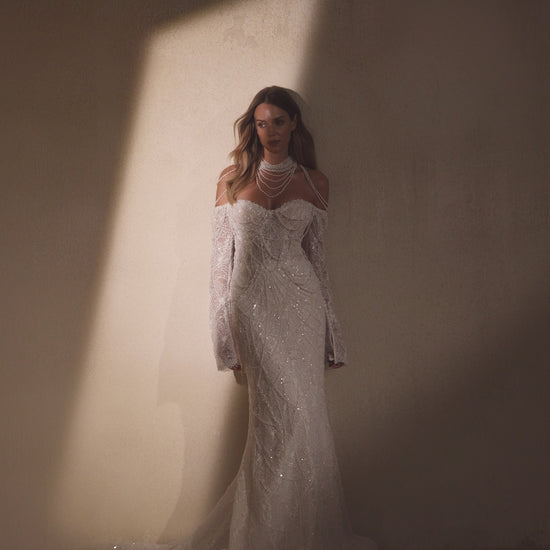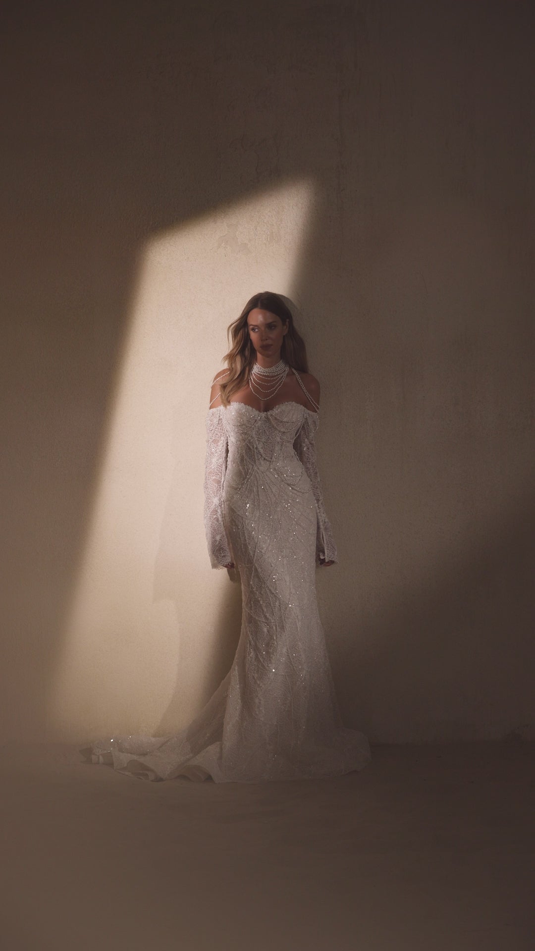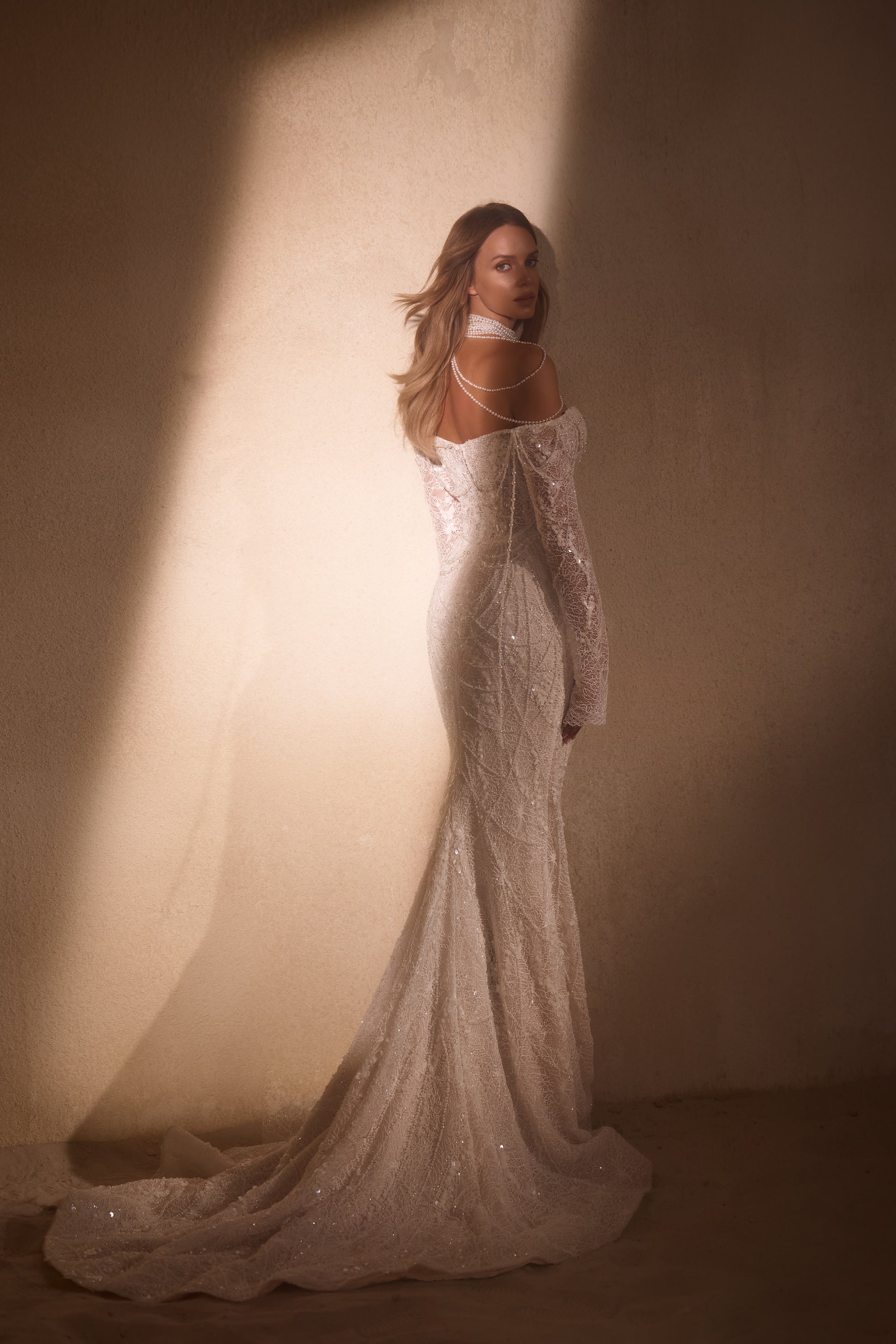 Die Anfertigung erfolgt nach der Bestellung - Bearbeitung ca. 8-12 Wochen. An exquisite mermaid dress is made from luxurious beaded lace with dense glitter coating. The bodice with a sweetheart neckline is adorned with crystal, pearl, and beads. It features long sleeves, a zipper closure, and internal lacing. The skirt smoothly goes into a train. The look can be enhanced with a necklace with pearls and crystals or a spectacular skirt that is manually embroidered with mesh ruffles.
