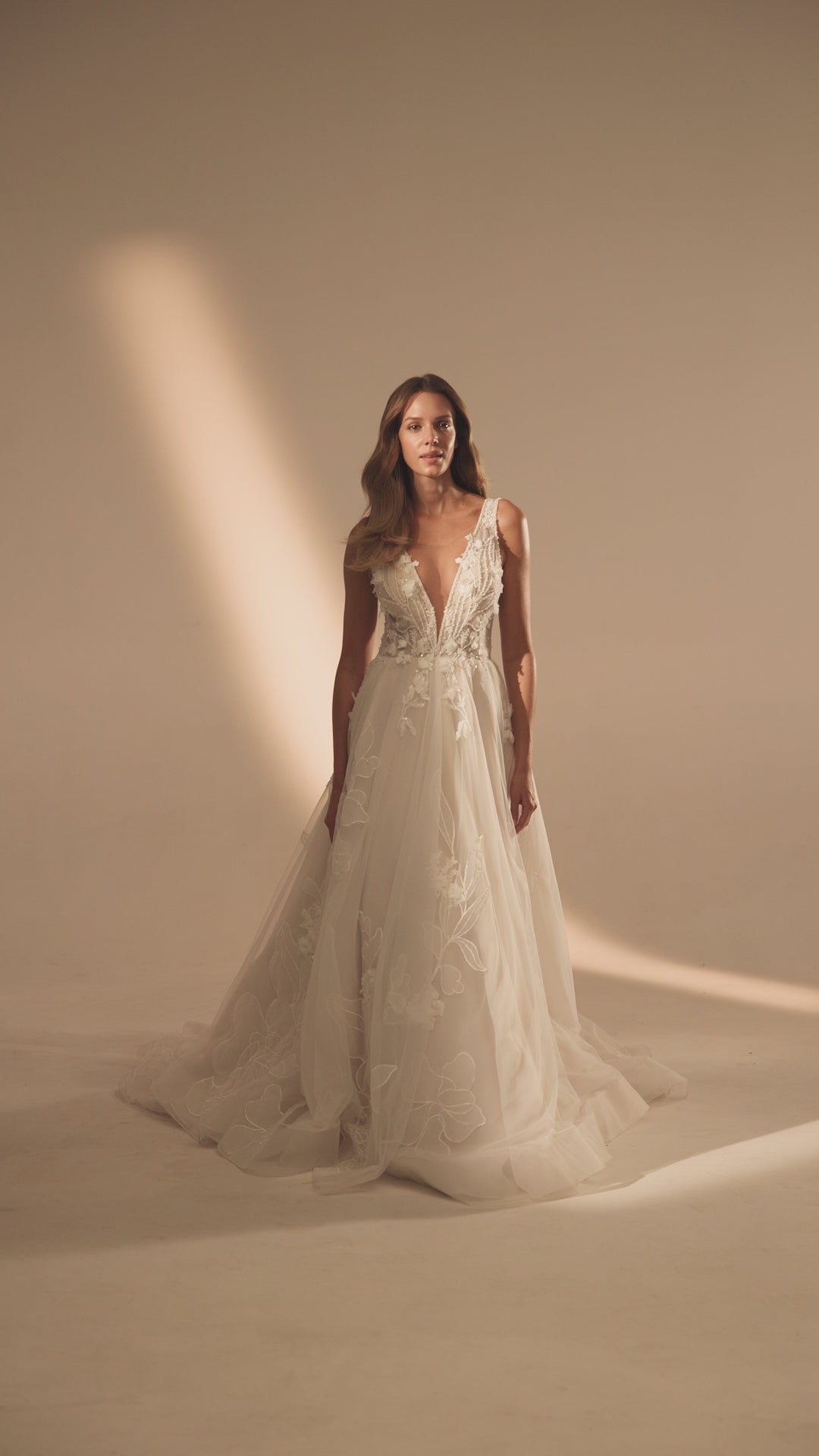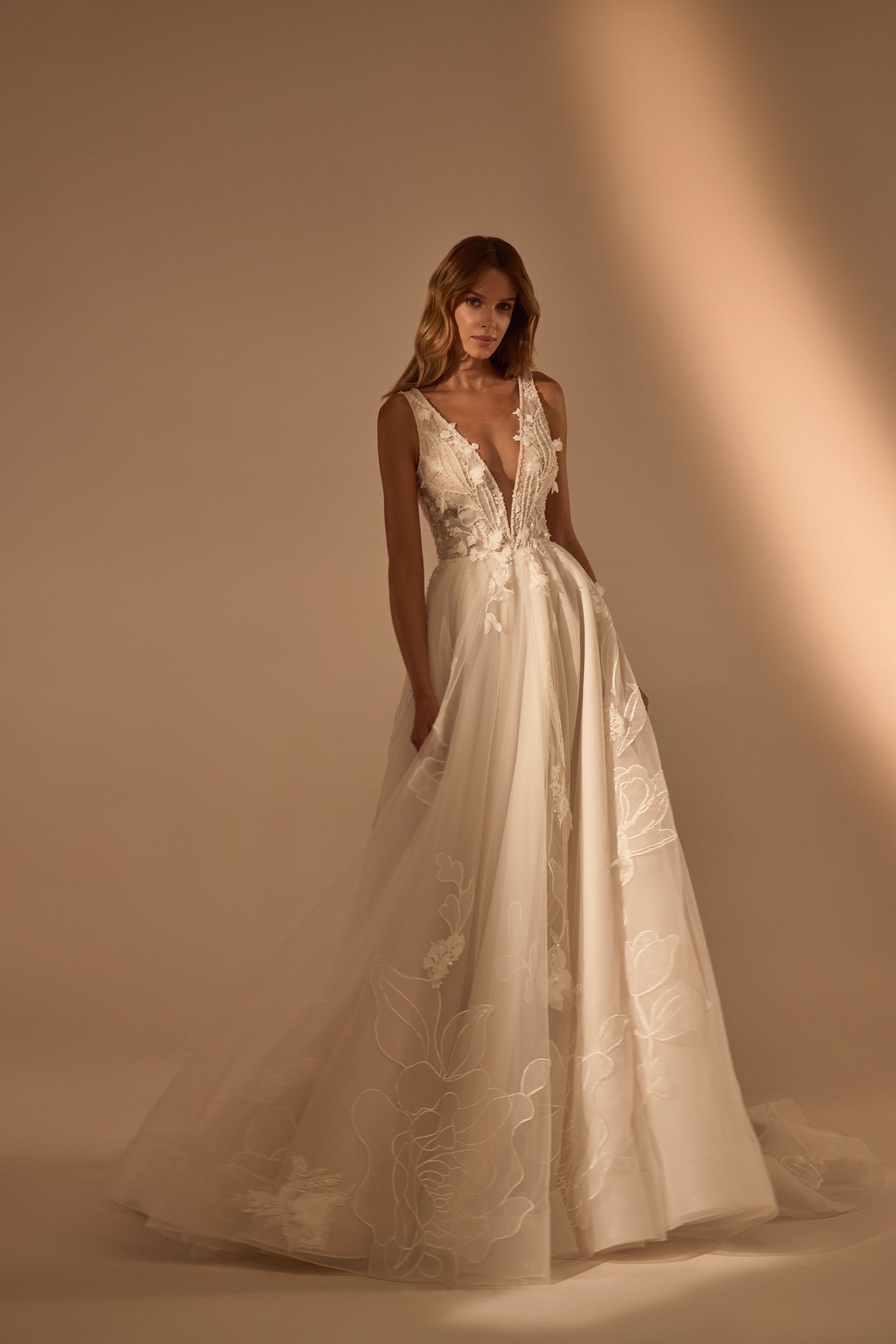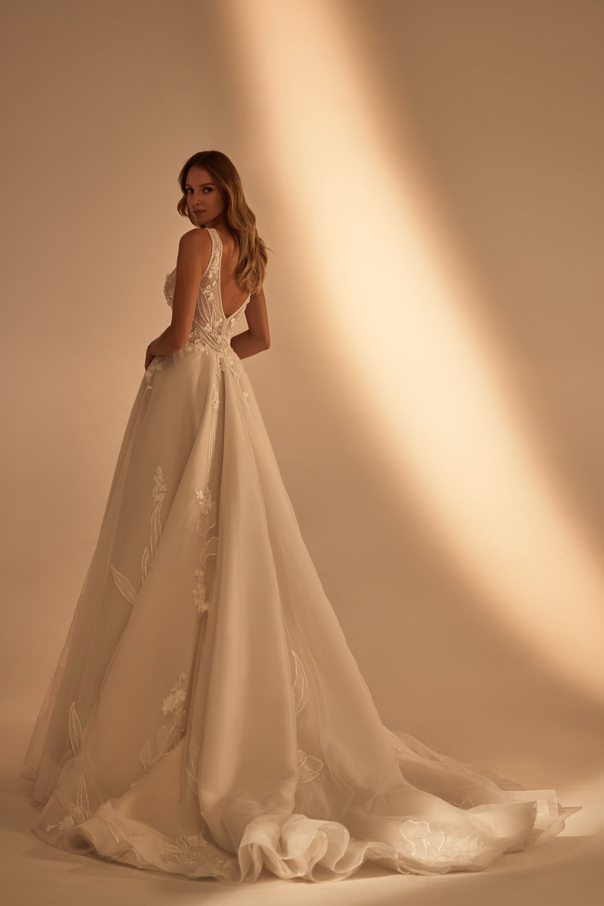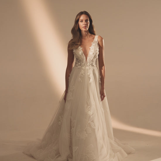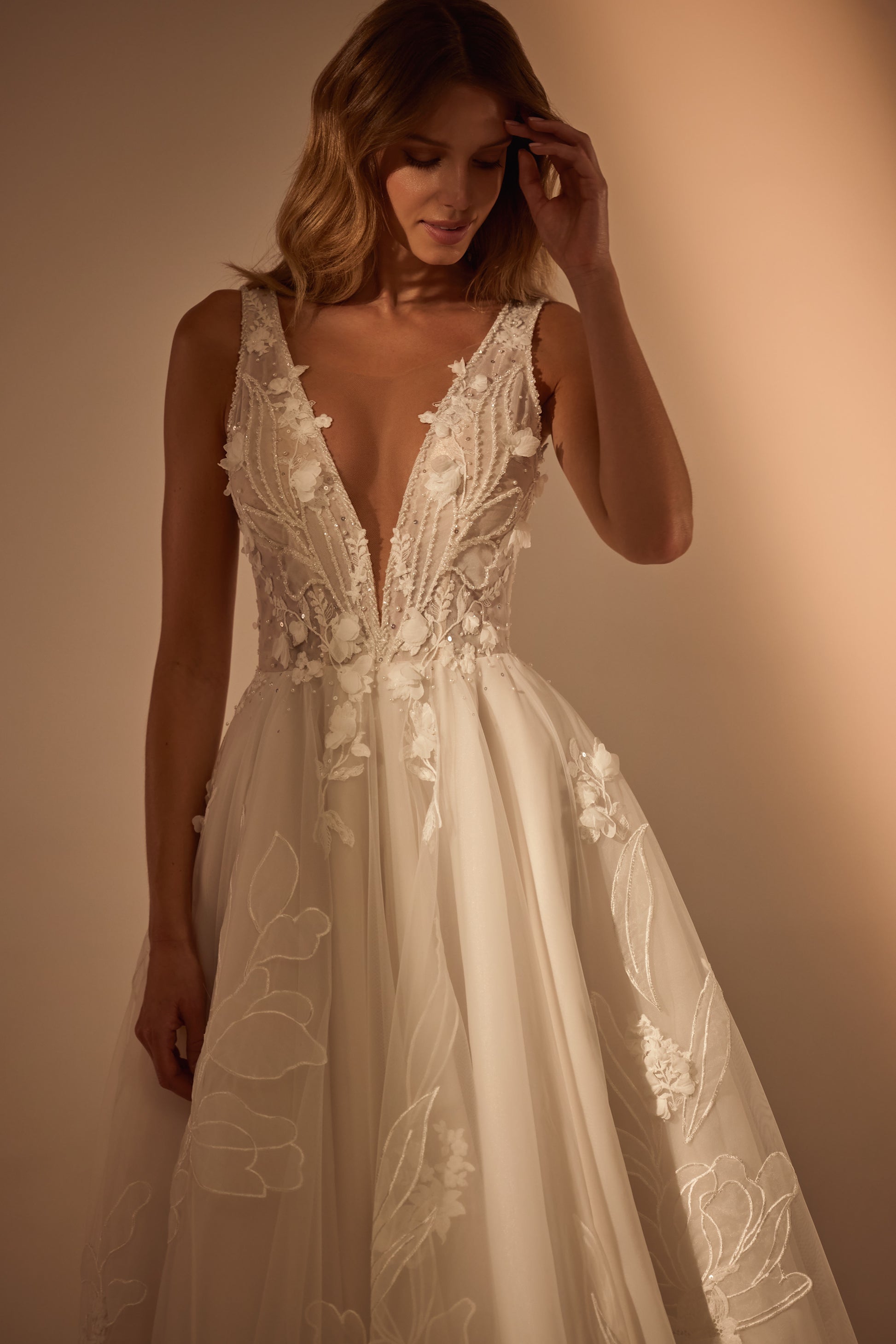 Die Anfertigung erfolgt nach der Bestellung - Bearbeitung ca. 8-12 Wochen. A romantic A-line gown is made of nude organza. The corset with a V-shaped neckline is adorned with voluminous flowers and embroidered with pearls, crystals, and beads. The back features a zipper closure. The skirt is embellished with a floral pattern and flows smoothly into a train.