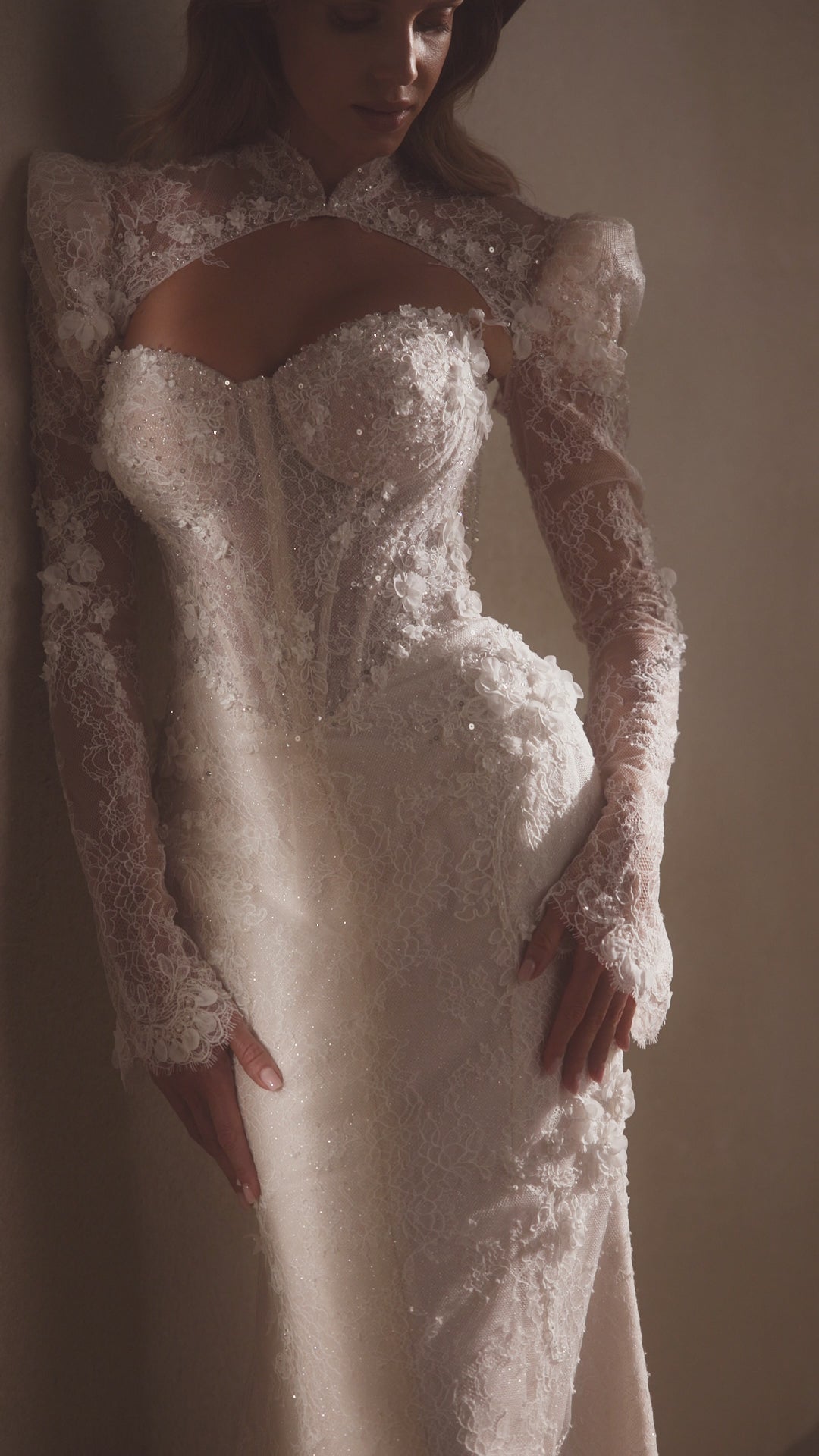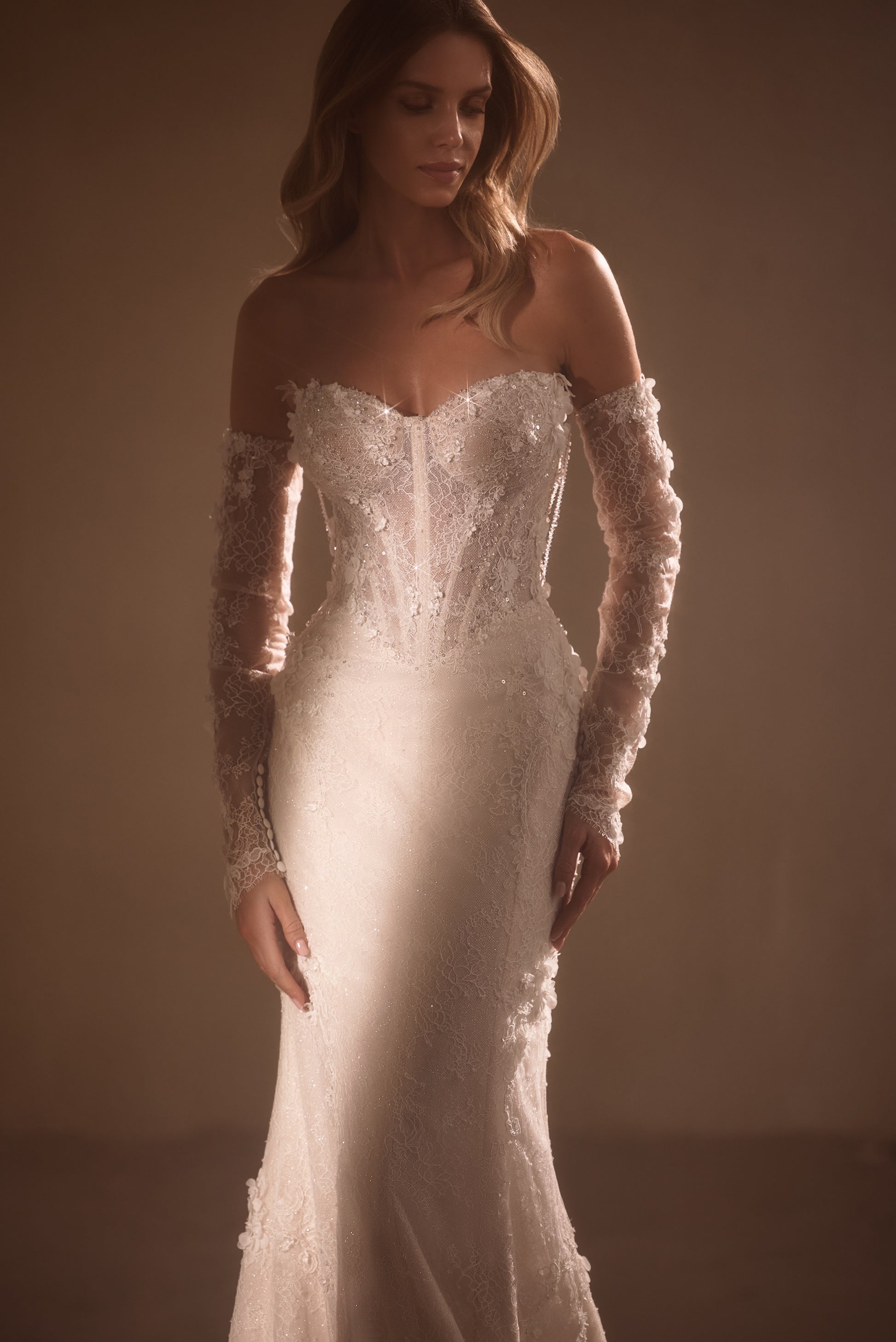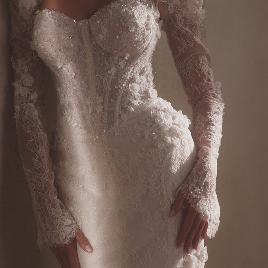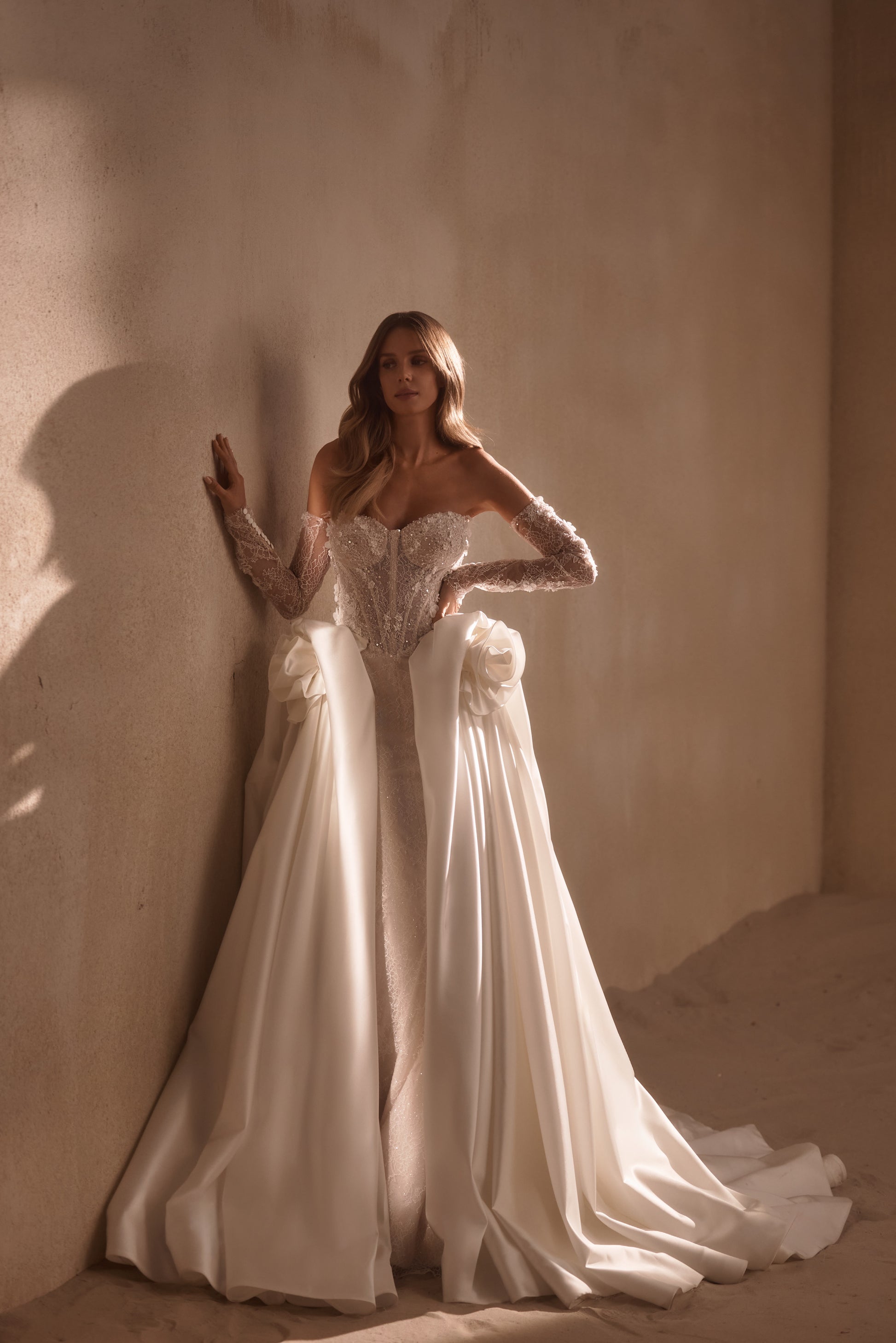 Die Anfertigung erfolgt nach der Bestellung - Bearbeitung ca. 8-12 Wochen. A romantic mermaid dress is made of Chantilly lace and sheen. The bodice is adorned with natural corded Chantilly lace and manually embroidered with sequins, pearls, and voluminous flowers. There is a zipper closure at the back. The semi-transparent back is embellished with an accessory that is made from beads and pearls. The hip-hugging skirt is also adorned with sparkles and flowers. The look can be embellished with several elements. The first is detachable sleeves decorated with lace and embroidery. The second is a bolero with a high neckline and long sleeves, that is also adorned with corded lace and sheen. The third is a detachable satin skirt that fastens at the waistline. It is decorated with manually made voluminous flowers and has a long train.