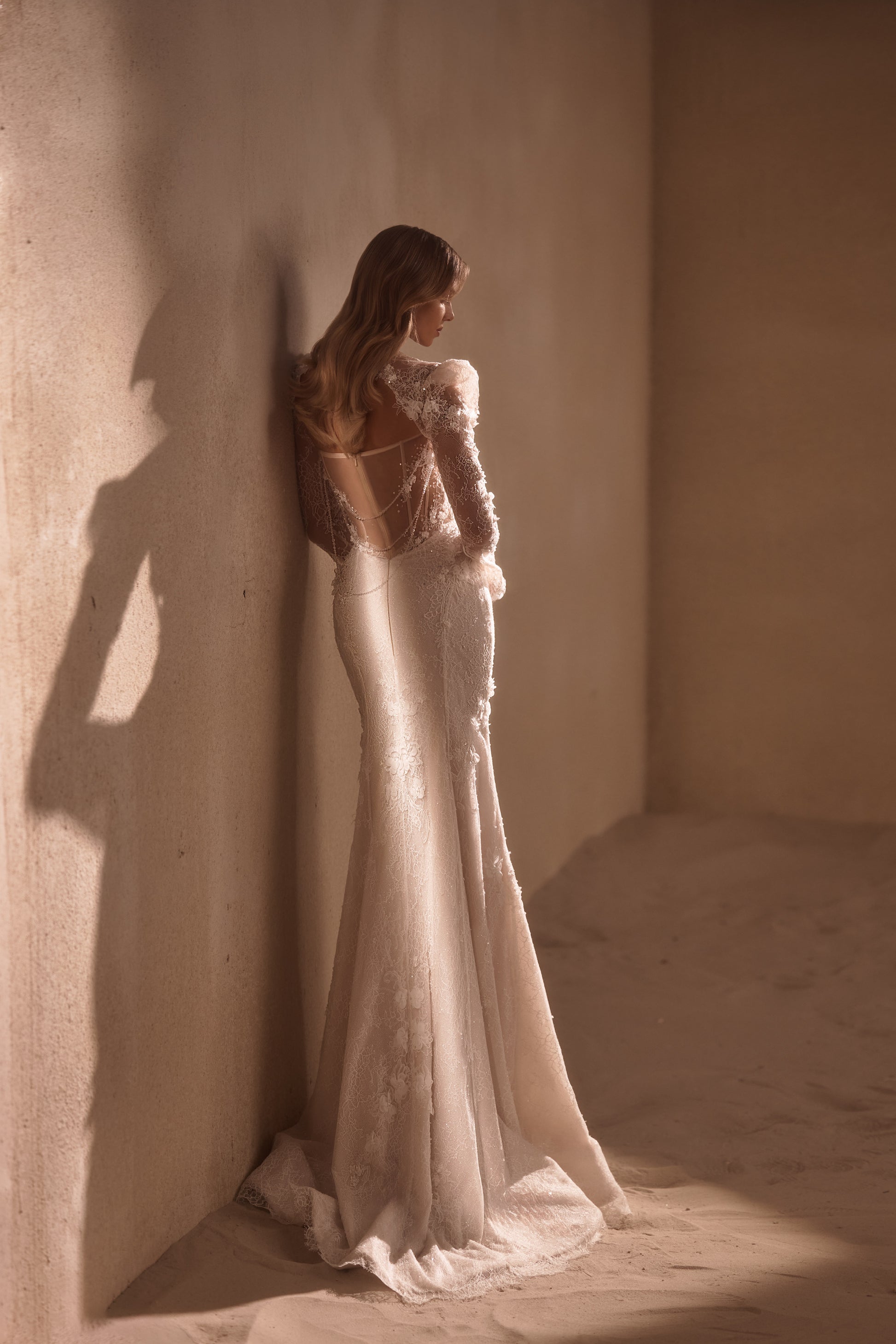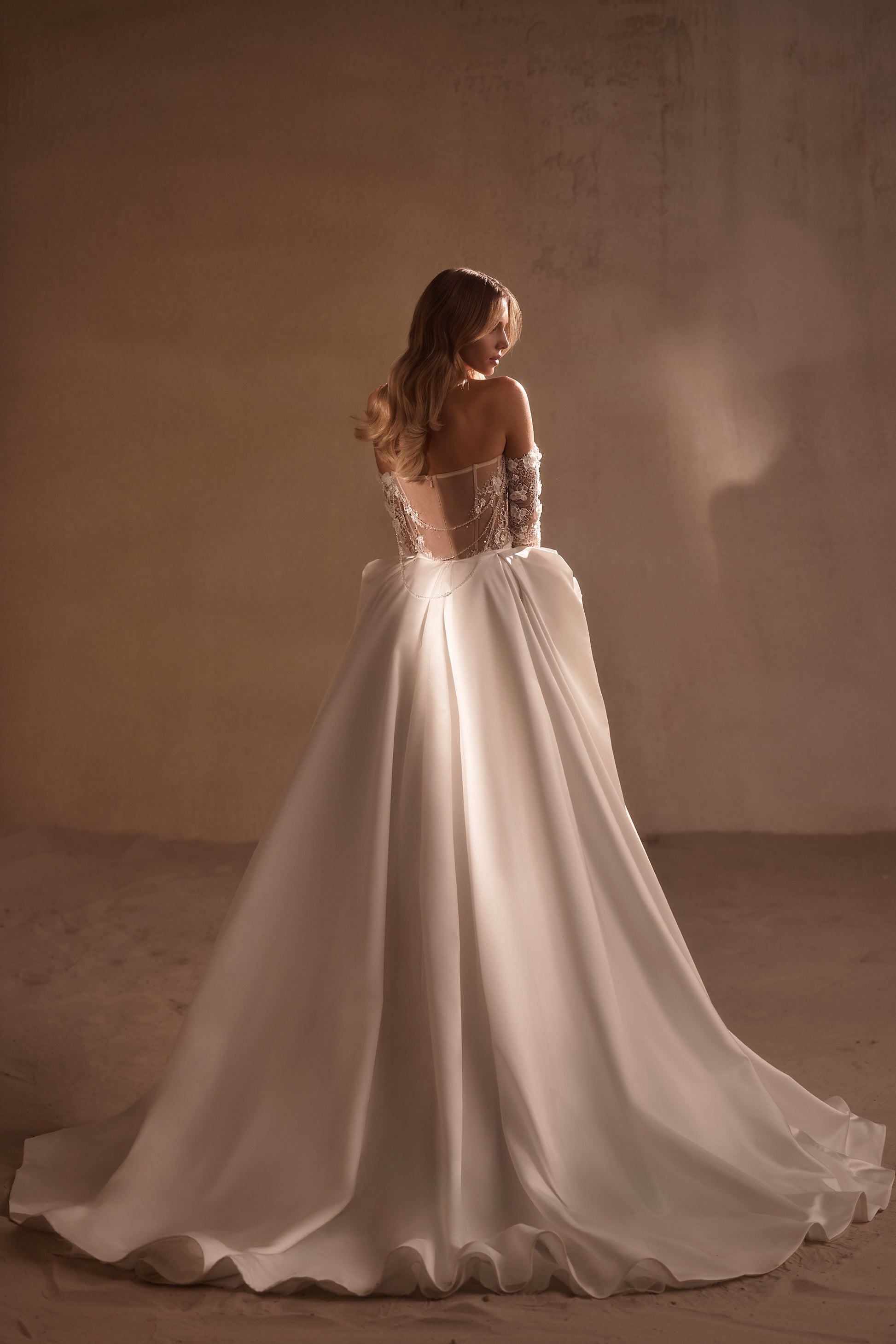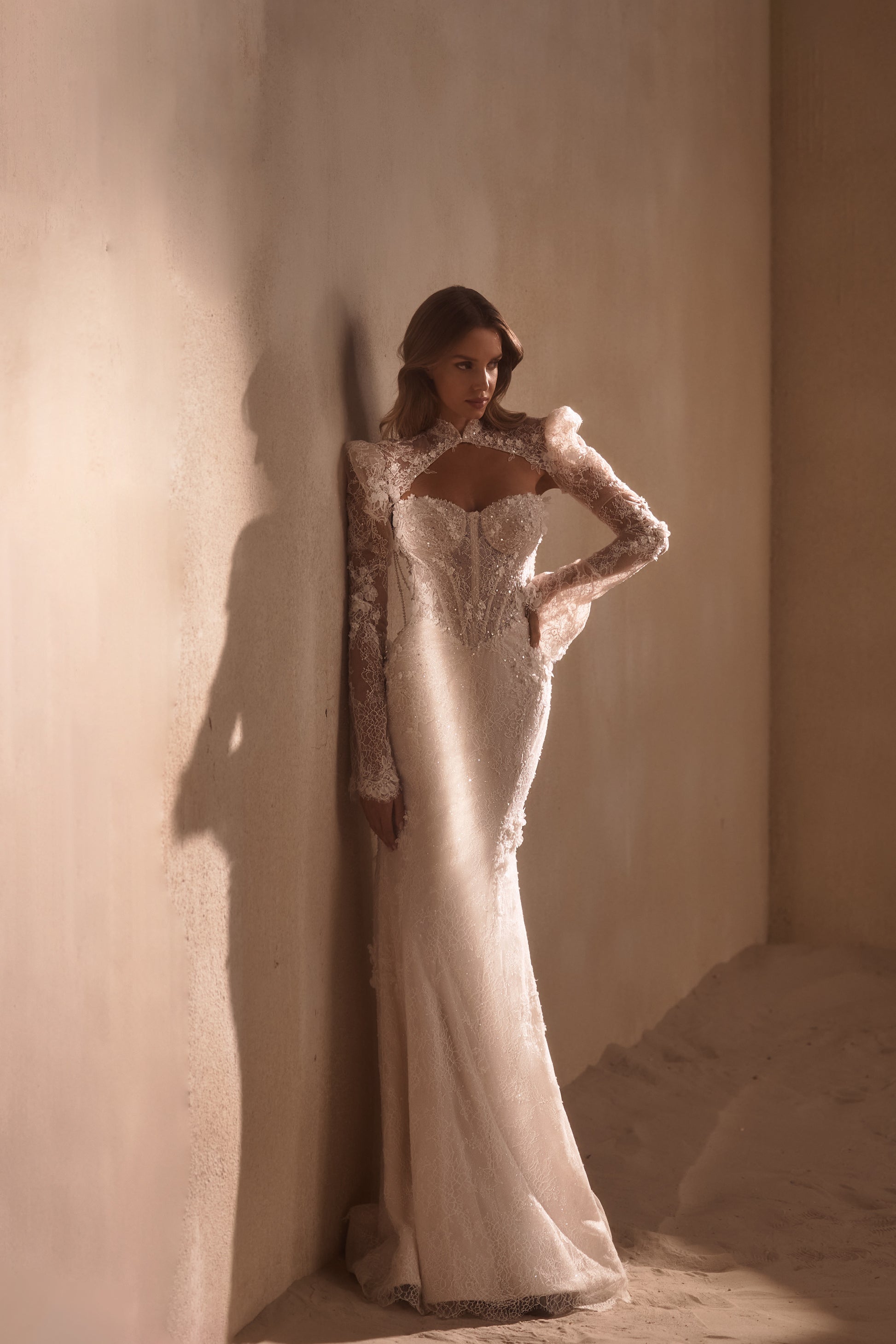 Die Anfertigung erfolgt nach der Bestellung - Bearbeitung ca. 8-12 Wochen. A romantic mermaid dress is made of Chantilly lace and sheen. The bodice is adorned with natural corded Chantilly lace and manually embroidered with sequins, pearls, and voluminous flowers. There is a zipper closure at the back. The semi-transparent back is embellished with an accessory that is made from beads and pearls. The hip-hugging skirt is also adorned with sparkles and flowers. The look can be embellished with several elements. The first is detachable sleeves decorated with lace and embroidery. The second is a bolero with a high neckline and long sleeves, that is also adorned with corded lace and sheen. The third is a detachable satin skirt that fastens at the waistline. It is decorated with manually made voluminous flowers and has a long train.