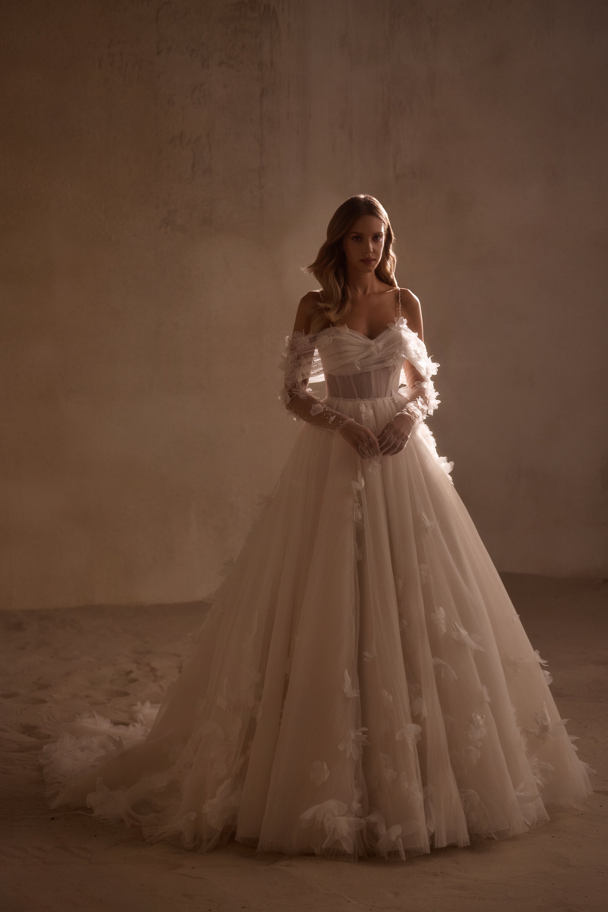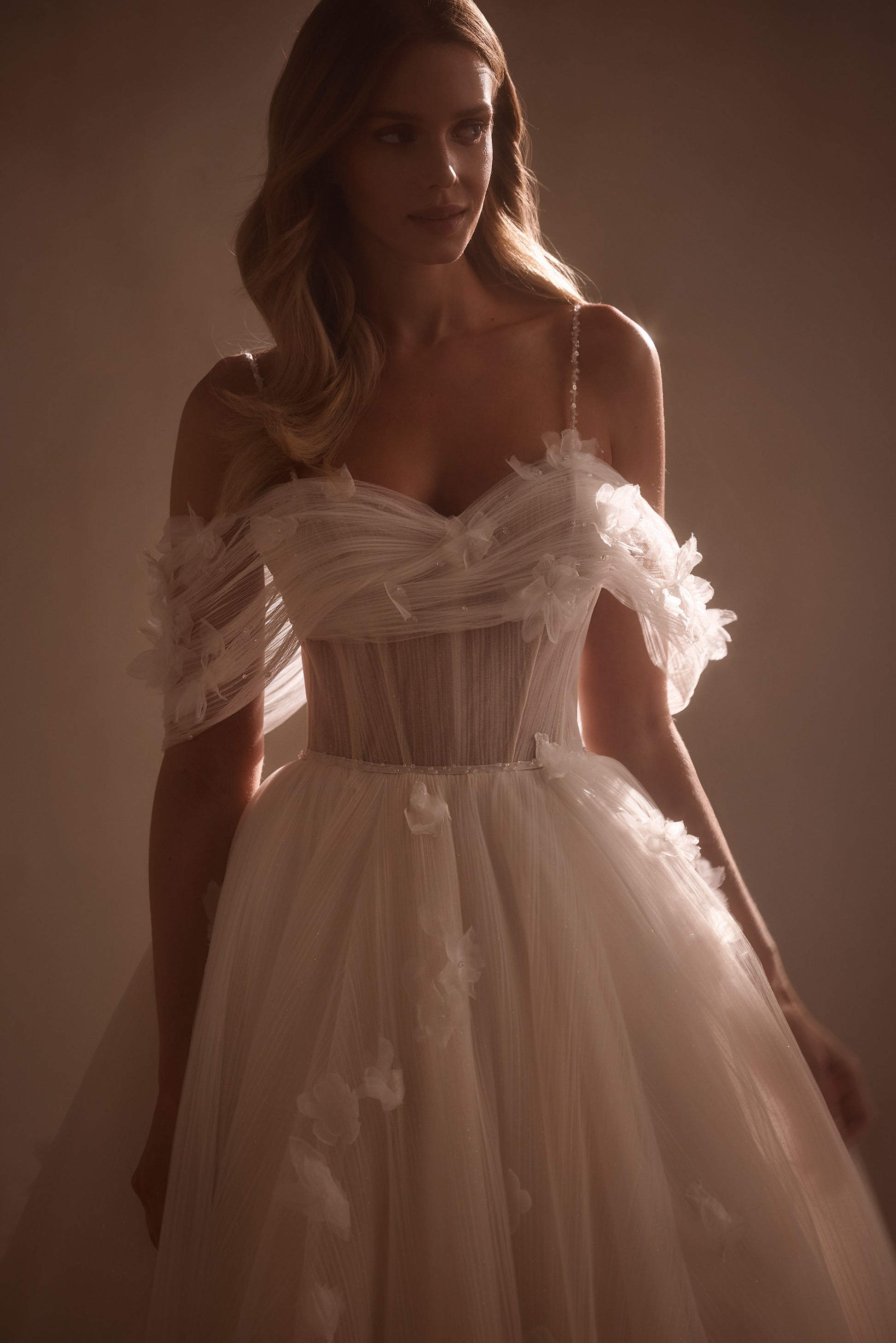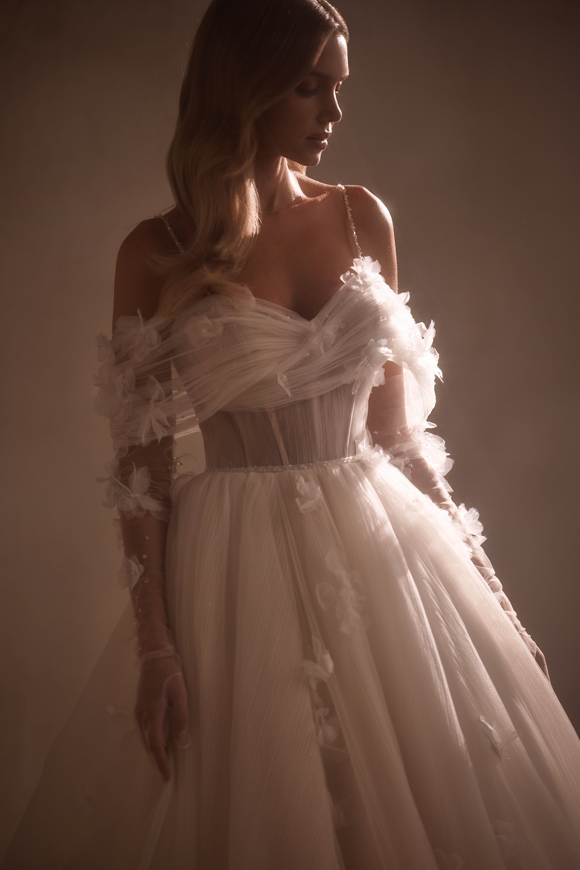 Die Anfertigung erfolgt nach der Bestellung - Bearbeitung ca. 8-12 Wochen. A romantic off-the-shoulder dress is made of pleated fabric and sheen. The bodice with thin straps is embellished with draping and voluminous organza flowers. There is a zipper and internal lacing at the back. A thin belt with sparkles emphasizes the waistline. The voluminous skirt with a train is also adorned with flowers. The look can be embellished with gloves that are embroidered with sparkles and flowers.