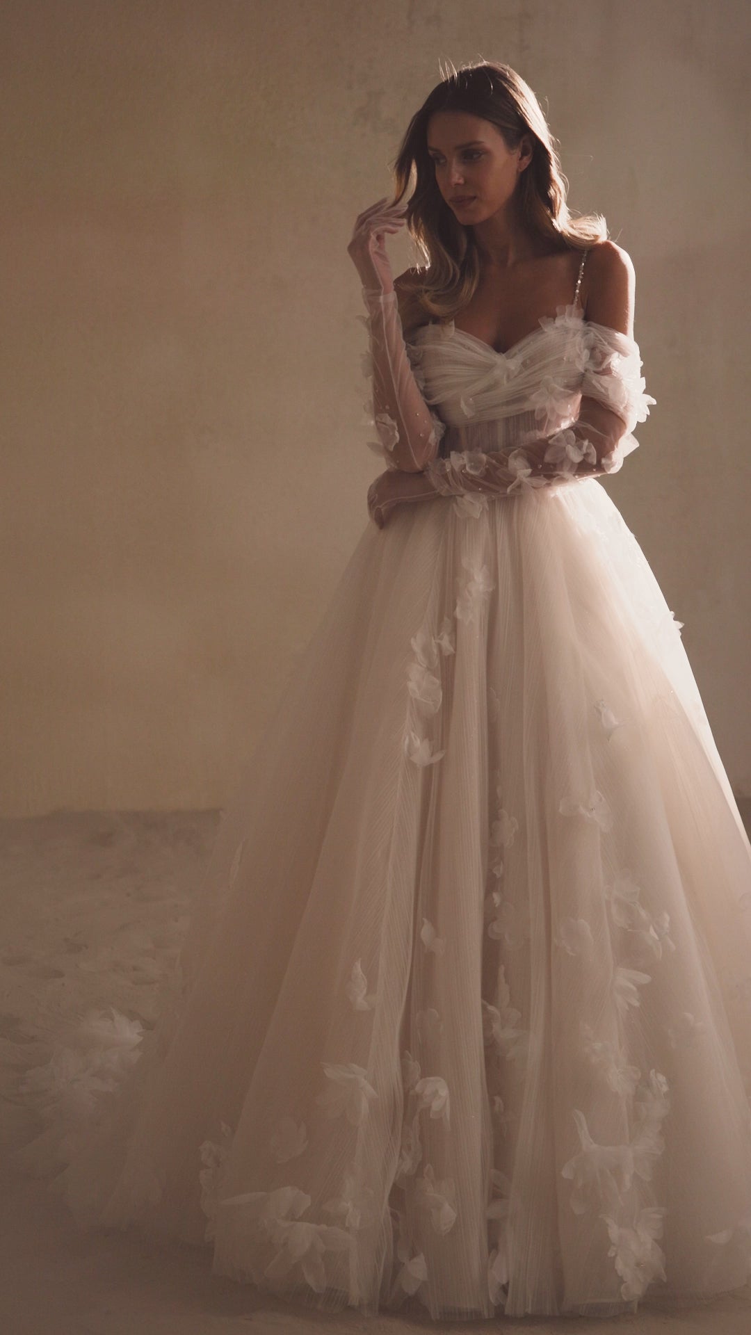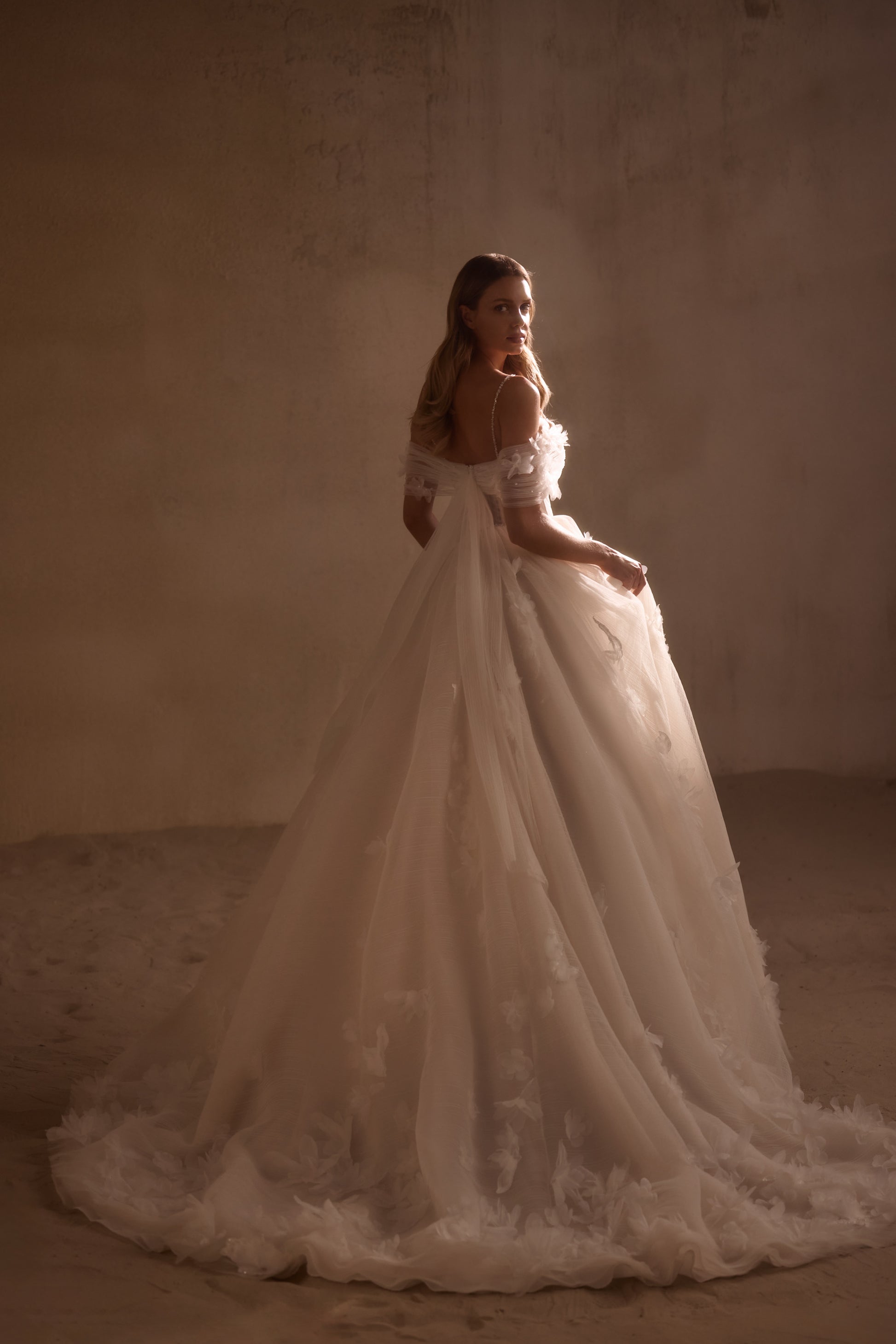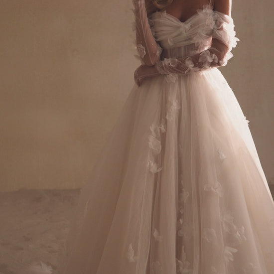Die Anfertigung erfolgt nach der Bestellung - Bearbeitung ca. 8-12 Wochen. A romantic off-the-shoulder dress is made of pleated fabric and sheen. The bodice with thin straps is embellished with draping and voluminous organza flowers. There is a zipper and internal lacing at the back. A thin belt with sparkles emphasizes the waistline. The voluminous skirt with a train is also adorned with flowers. The look can be embellished with gloves that are embroidered with sparkles and flowers.